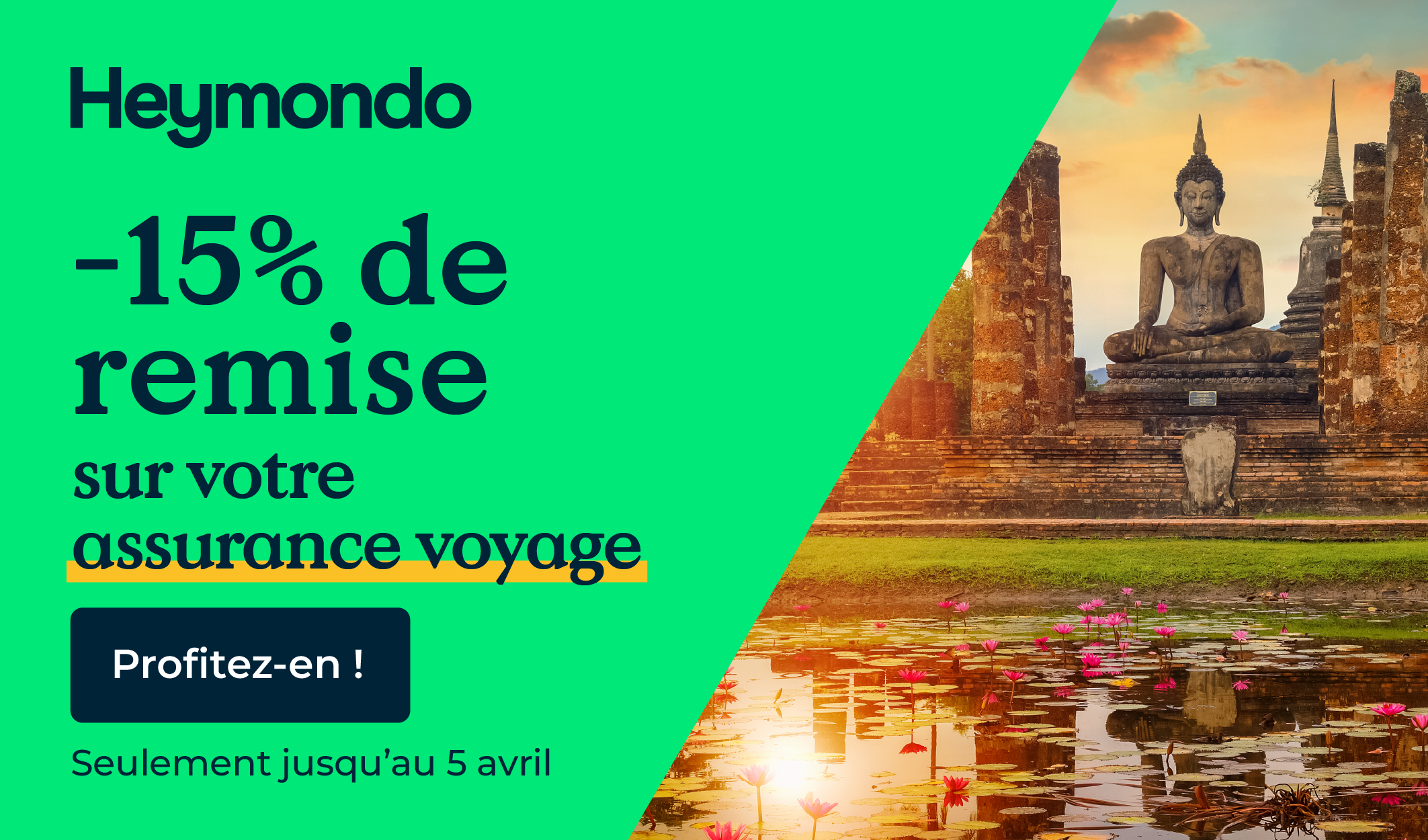 Du 26 mars au 5 avril inclus, vous bénéficiez d’une réduction exceptionnelle de -15% (au lieu de -5%) sur votre assurance voyage Heymondo en venant de mon blog.
