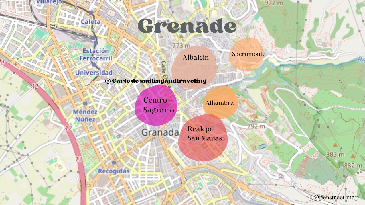 Pour vous simplifier les recherches et vous donner une idée des quartiers de la ville, je vous ai placé (approximativement) les différents quartiers de Grenade dont on va parler plus bas. Alors voici ma petite carte des quartiers de Grenade pour choisir où loger facilement !