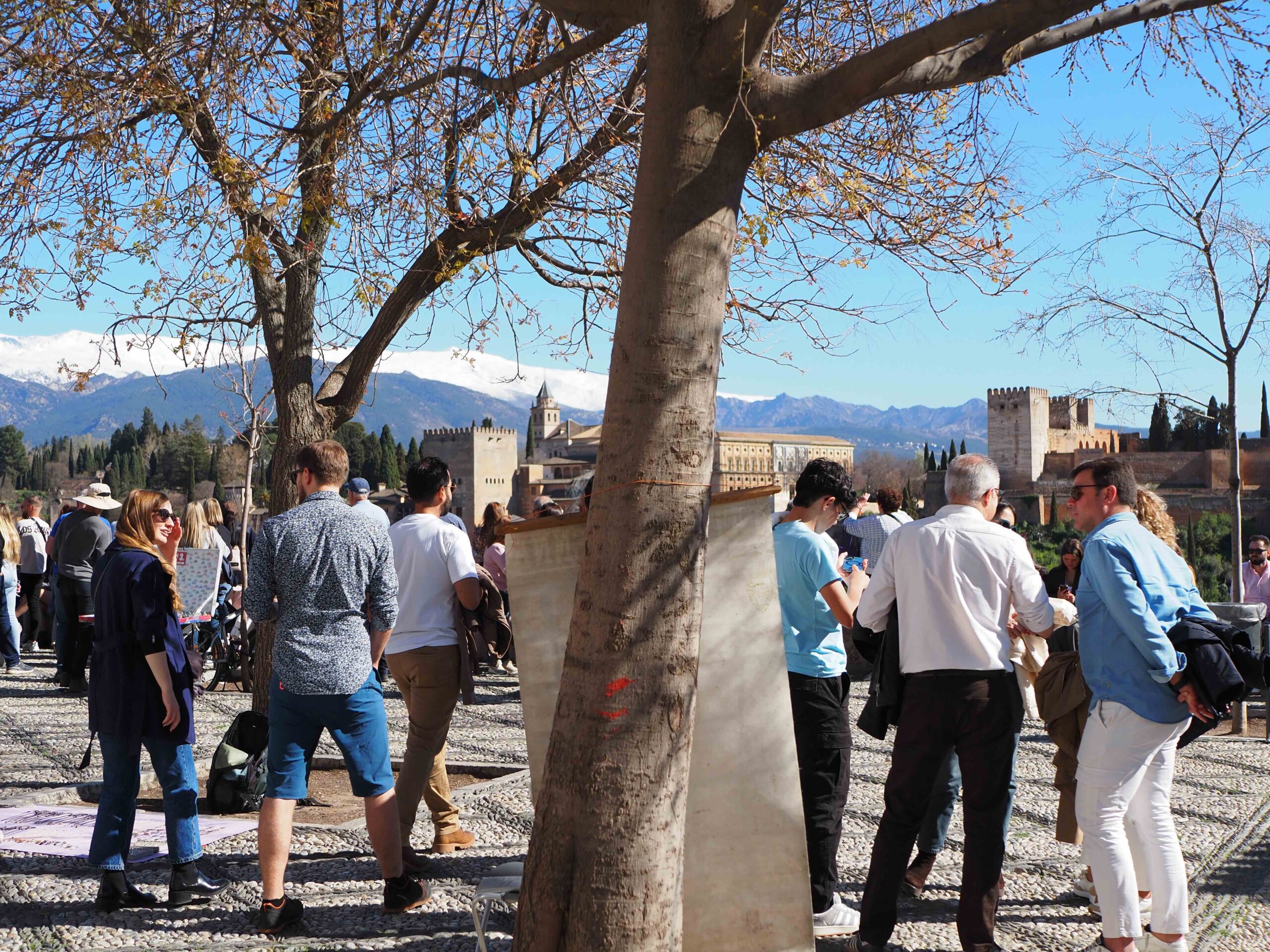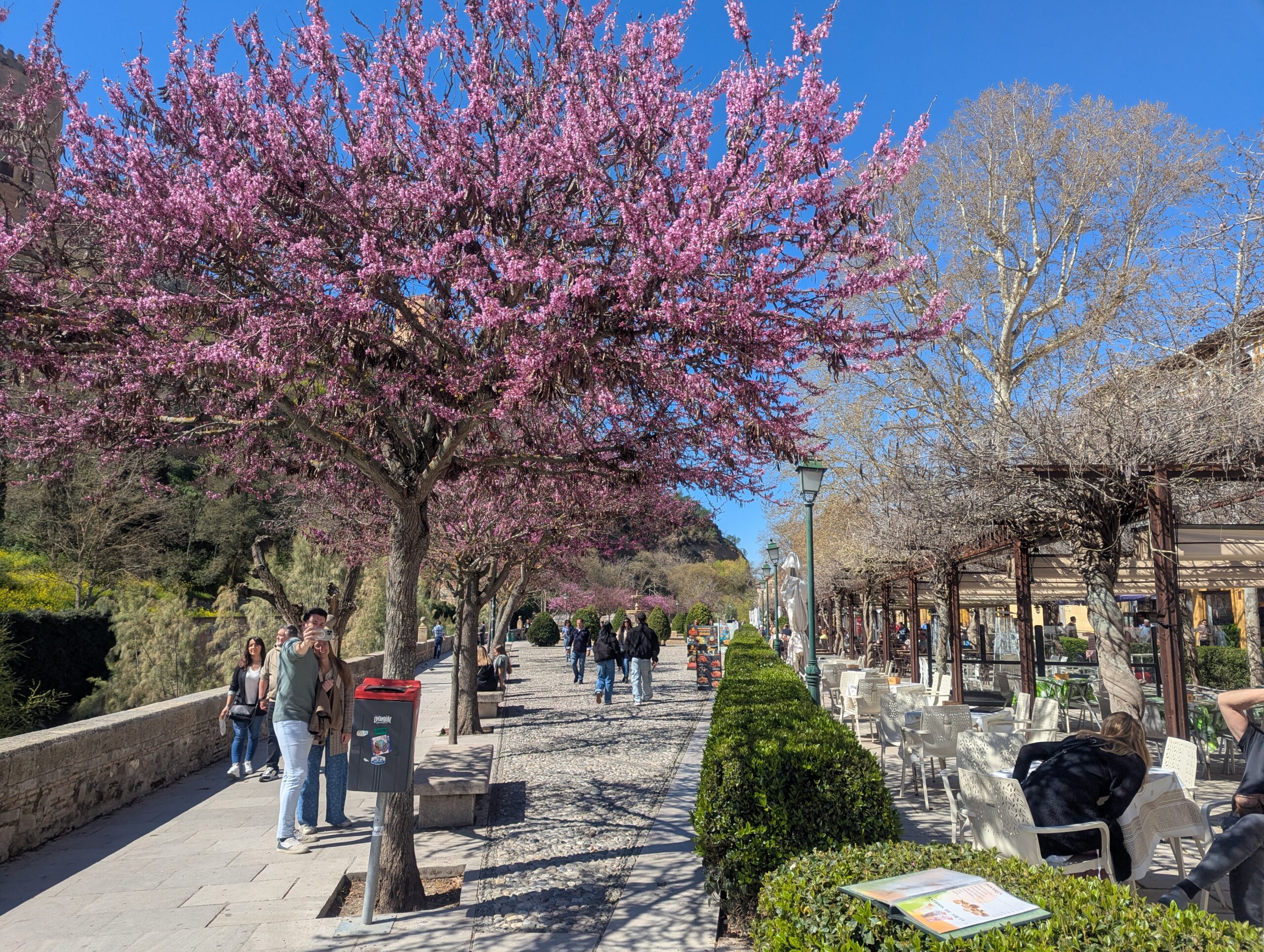 Aujourd’hui, l’ambiance est bien différente : terrasses de restaurants, musiciens de rue, des gens qui se baladent, arbres en fleur (si vous y êtes à la bonne saison)… C’est un endroit parfait pour se balader en fin de journée, avec la lumière qui change et colore les murs de l’Alhambra.