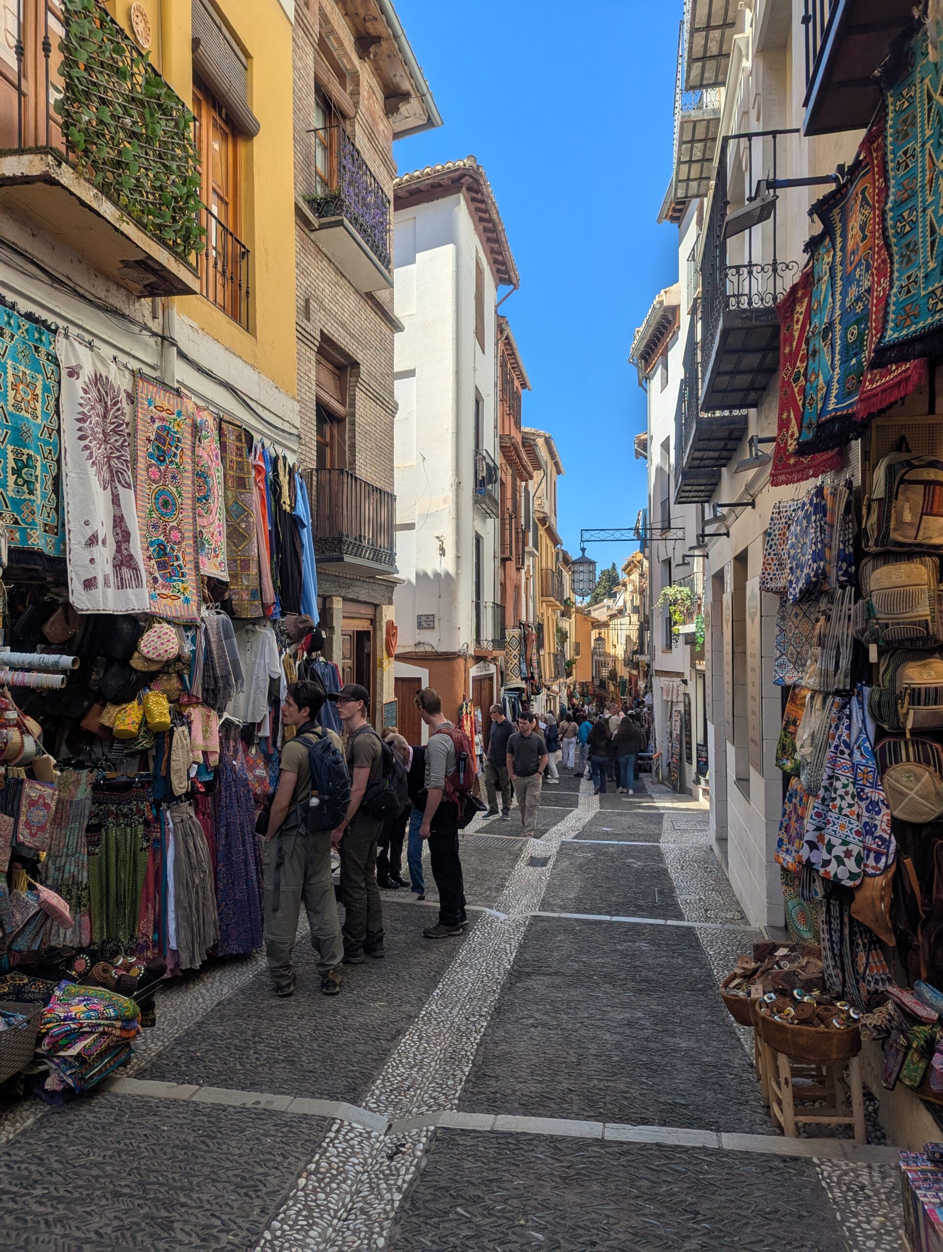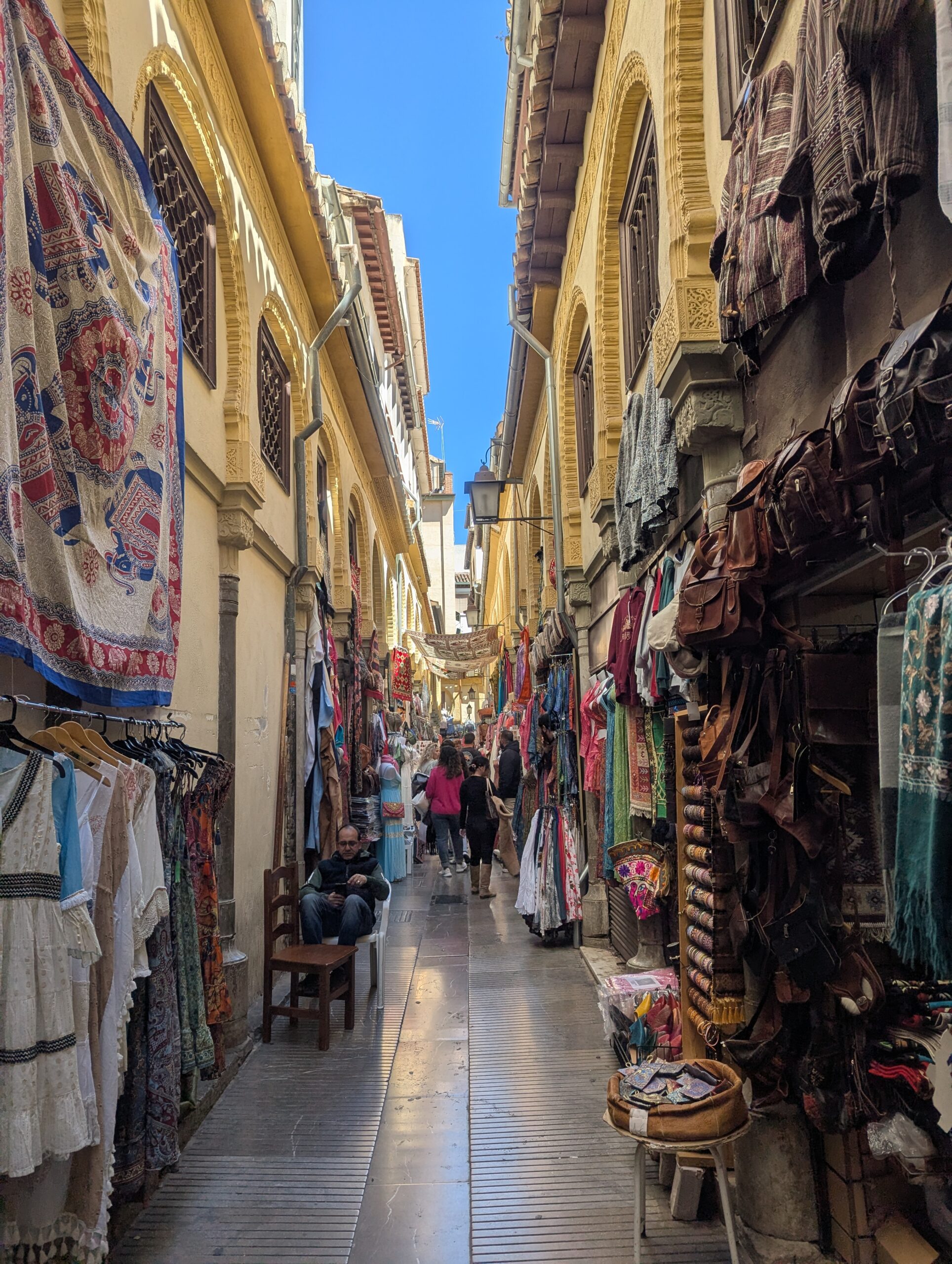 À deux pas de la cathédrale, ne manquez pas l’Alcaicería, l’ancien souk de Grenade. À l’époque, ce marché était dédié au commerce de la soie. Aujourd’hui, il a été reconstruit et abrite de nombreuses petites boutiques de souvenirs. Je n’ai pas trouvé mon bonheur dans ces boutiques qui vendent toutes sensiblement la même chose. Des souvenirs que j’ai déjà vu lors de voyages précédents en Turquie, en Inde ou à Marrakech. Mais c’est sympa à voir une fois, ne serait-ce que pour l’ambiance. On y retrouve une ambiance orientale avec des ruelles étroites, des lanternes, des céramiques, des foulards.