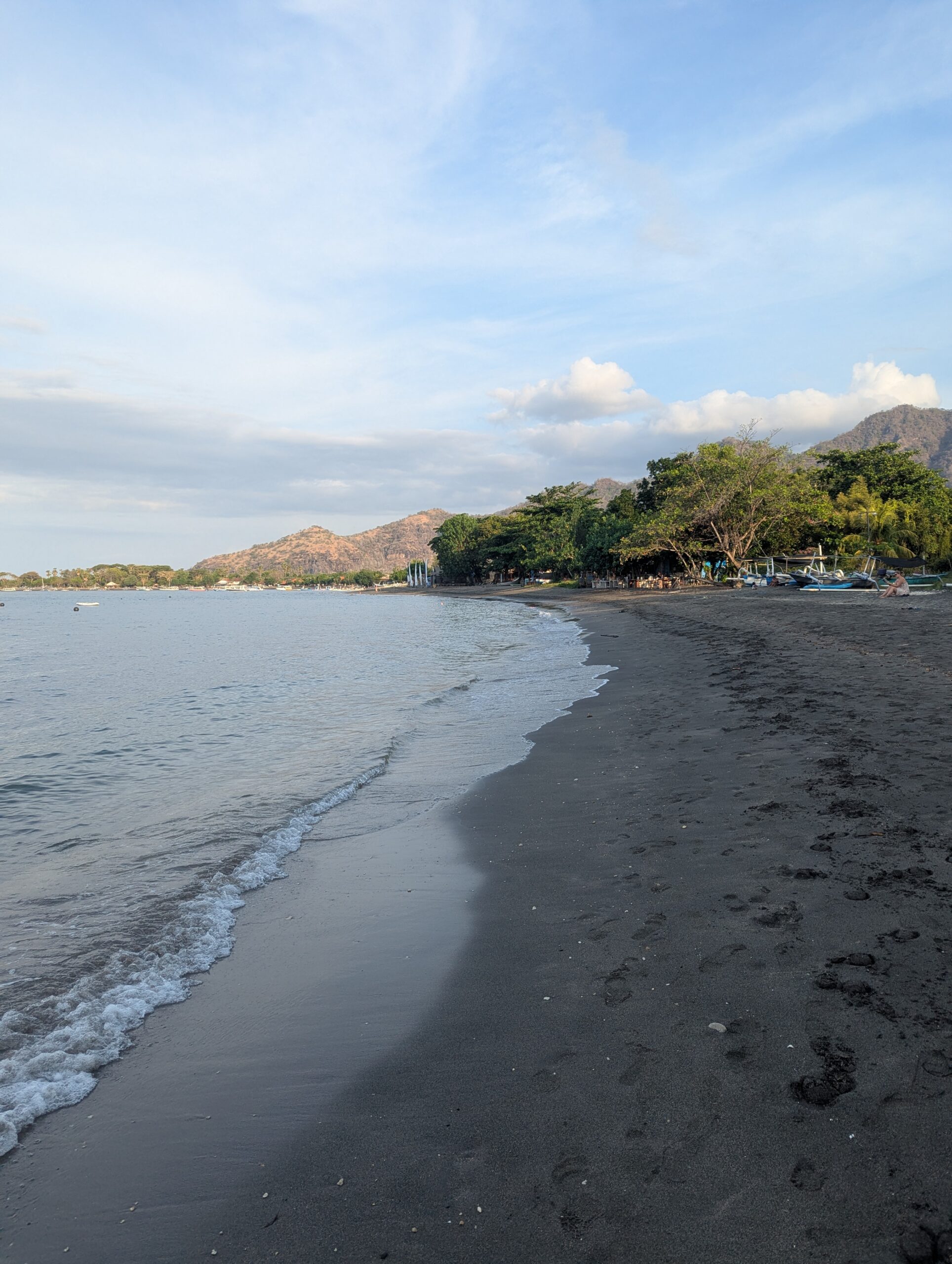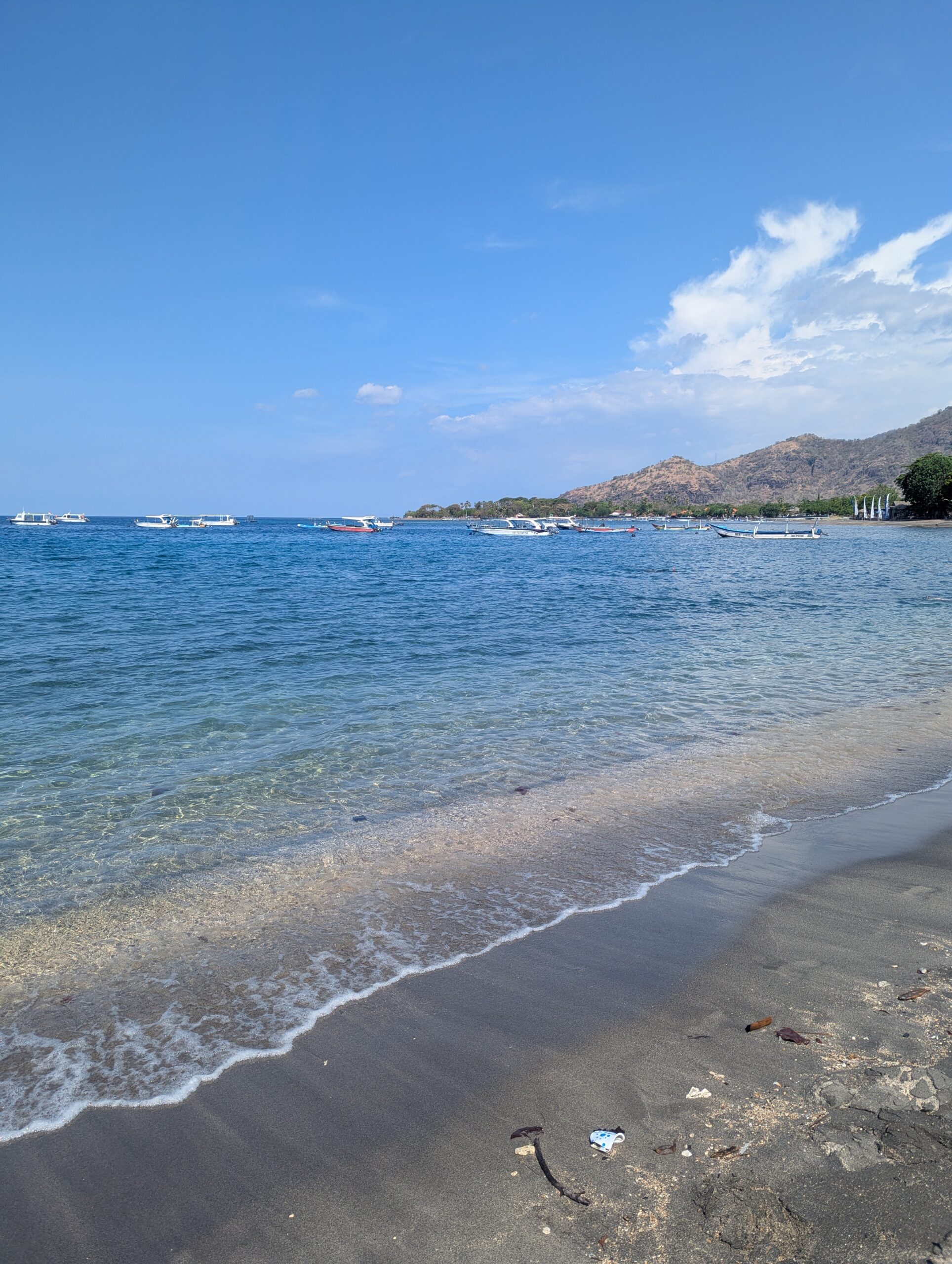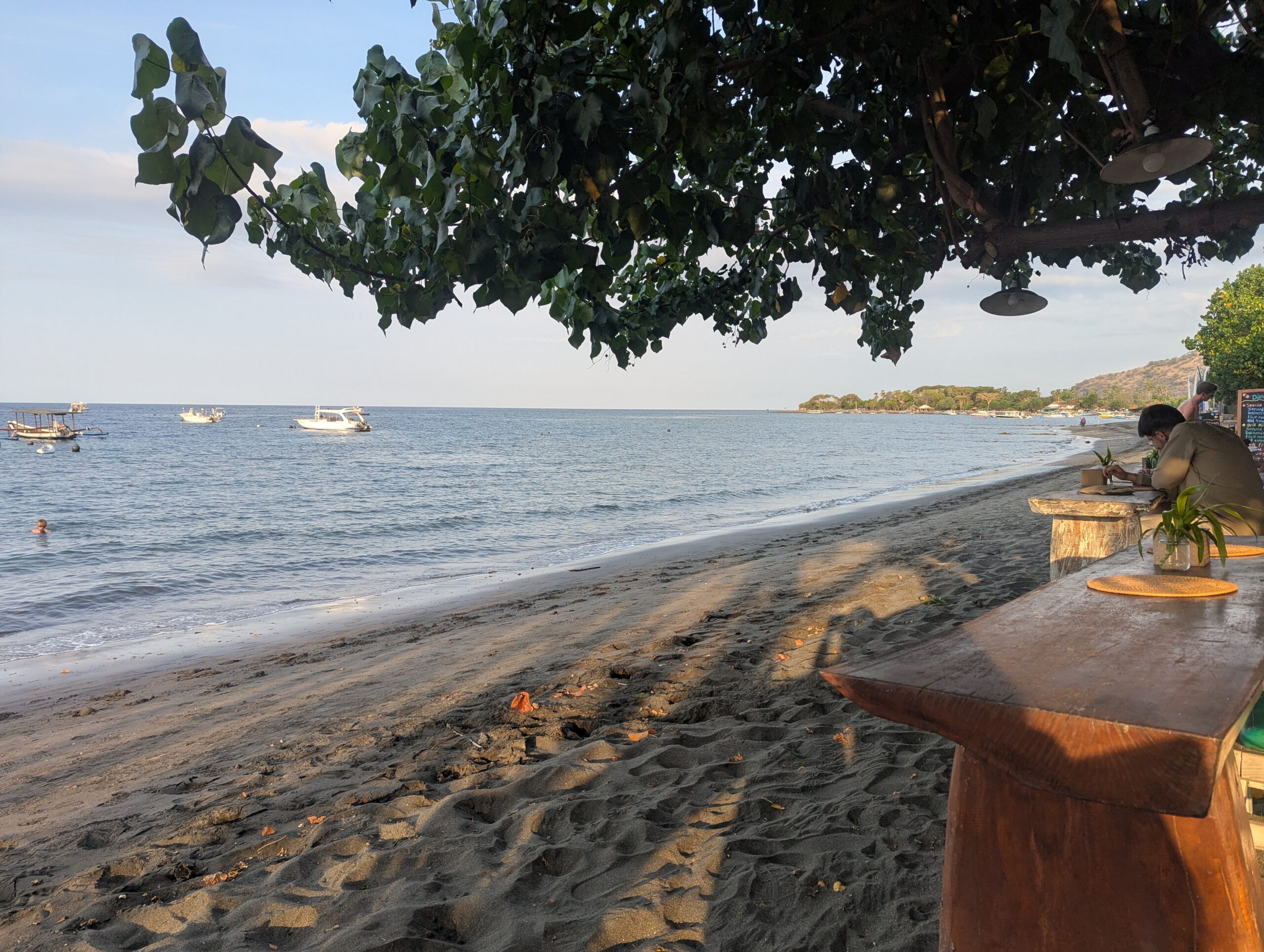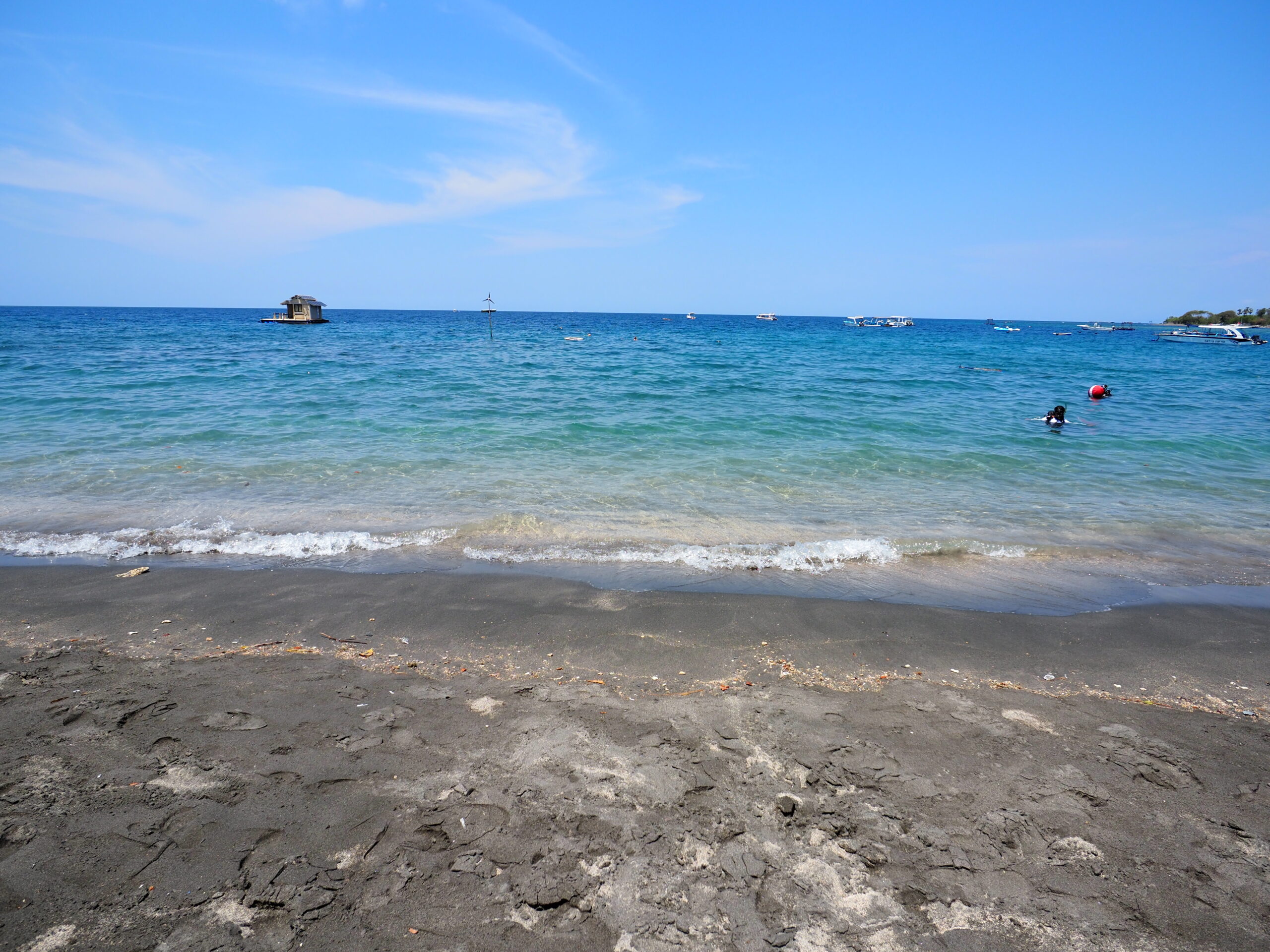 La plage principale de Pemuteran est une plage de sable noir et gris. Visuellement, j’ai préféré les plages de Amed, également de plages de sable noir.