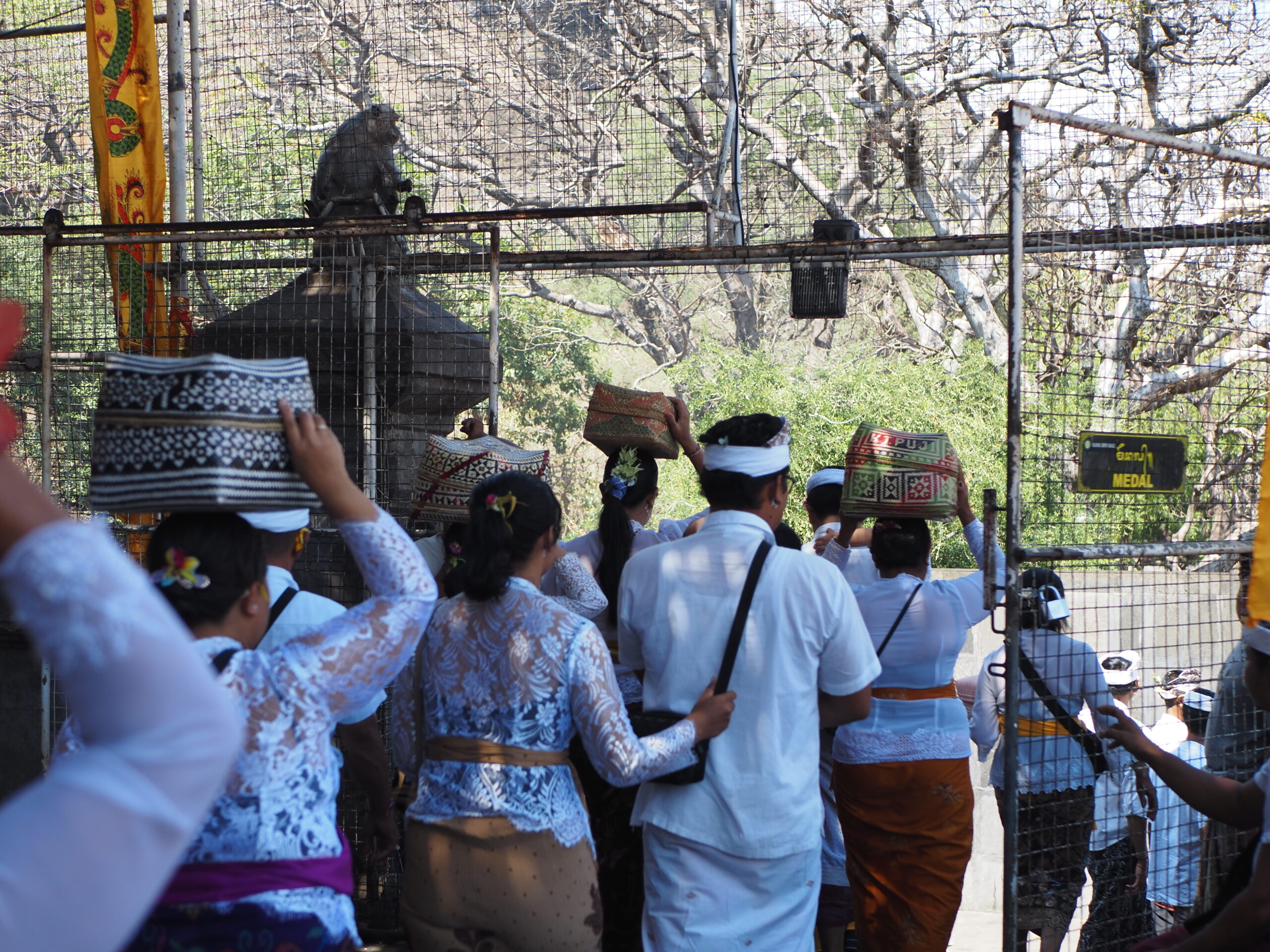 Si vous n’êtes pas très à l’aise avec les singes, rassurez-vous : le temple est entouré de grilles, ce qui évite qu’ils entrent directement dans l’enceinte principale. À l’entrée, on vous demandera de porter un sarong, fourni sur place, ainsi que de faire un don. Nous avons vu que les voyageurs précédents donnaient environ 30 000 IDR, nous avons fait la même chose pour deux personnes, et cela semblait tout à fait approprié.