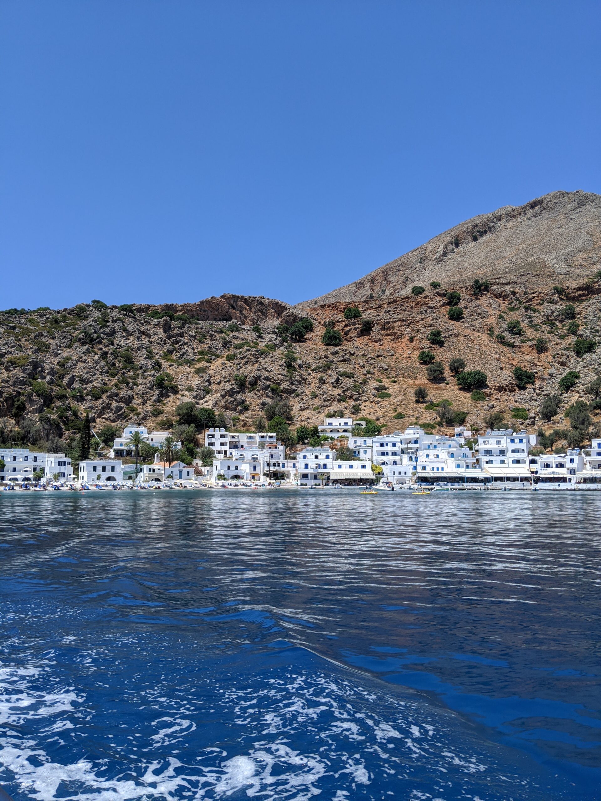 Loutro, c’est un magnifique petit village blanc, au bord de l’eau. C’est vraiment l’image de la Grèce pour moi. Ce petit village accessible uniquement à pied ou en bateau est complètement coupé du monde. Pas de voitures, que des maisons blanches face à la mer, une eau transparente et une ambiance paisible. Vous pouvez vous poser en terrasse au bord de l’eau. Mais pour être honnête ce qu’on a le plus apprécié c’est le chemin pour y aller…