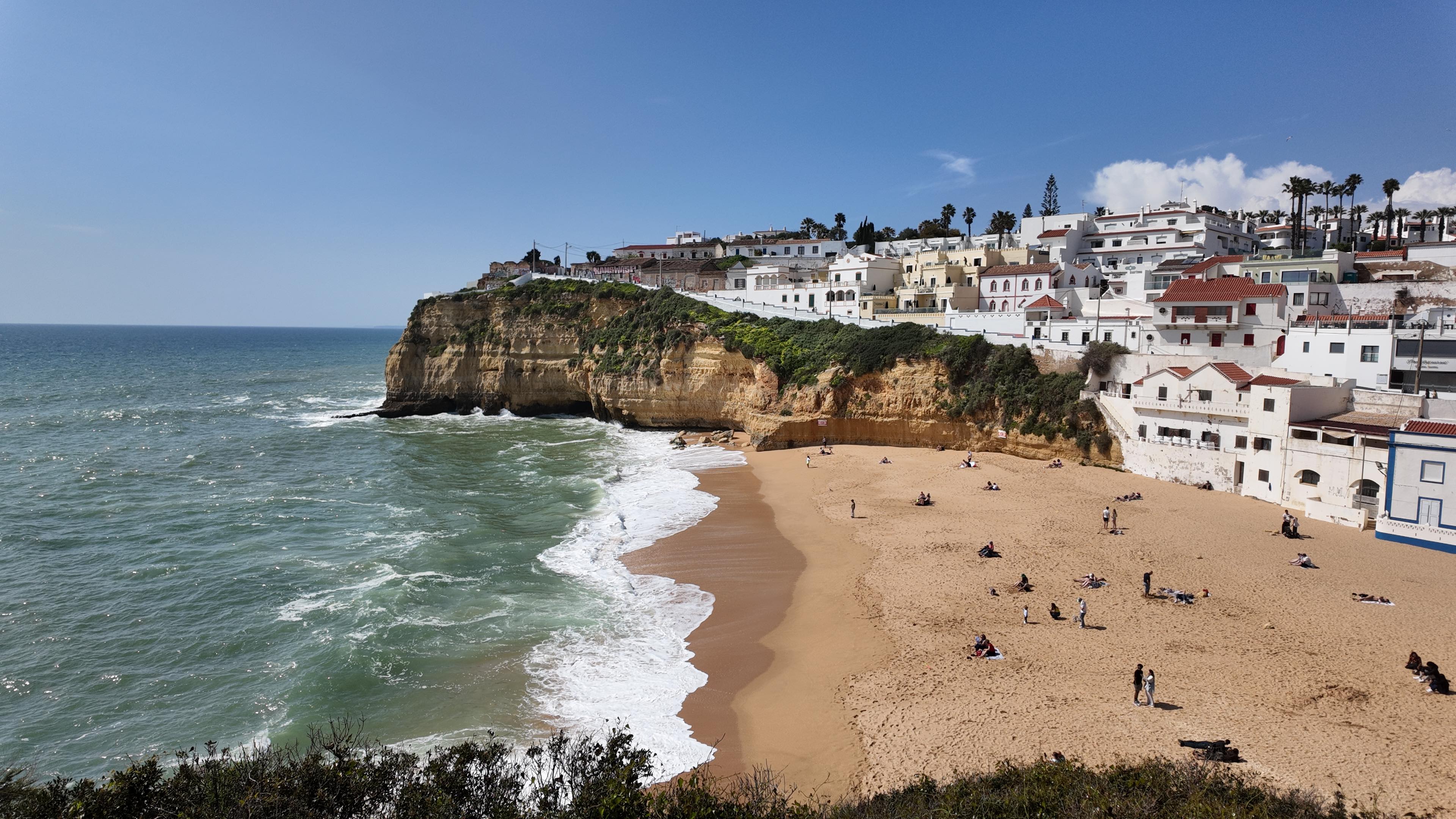 Un peu plus loin, la plage de Benagil est aussi très sympa. C’est un point de départ pour les sorties en kayak vers la grotte. Quand on y était fin mars, il y avait déjà des gens dans l’eau. L’ambiance est assez animée, mais ça reste agréable (en hors saison).