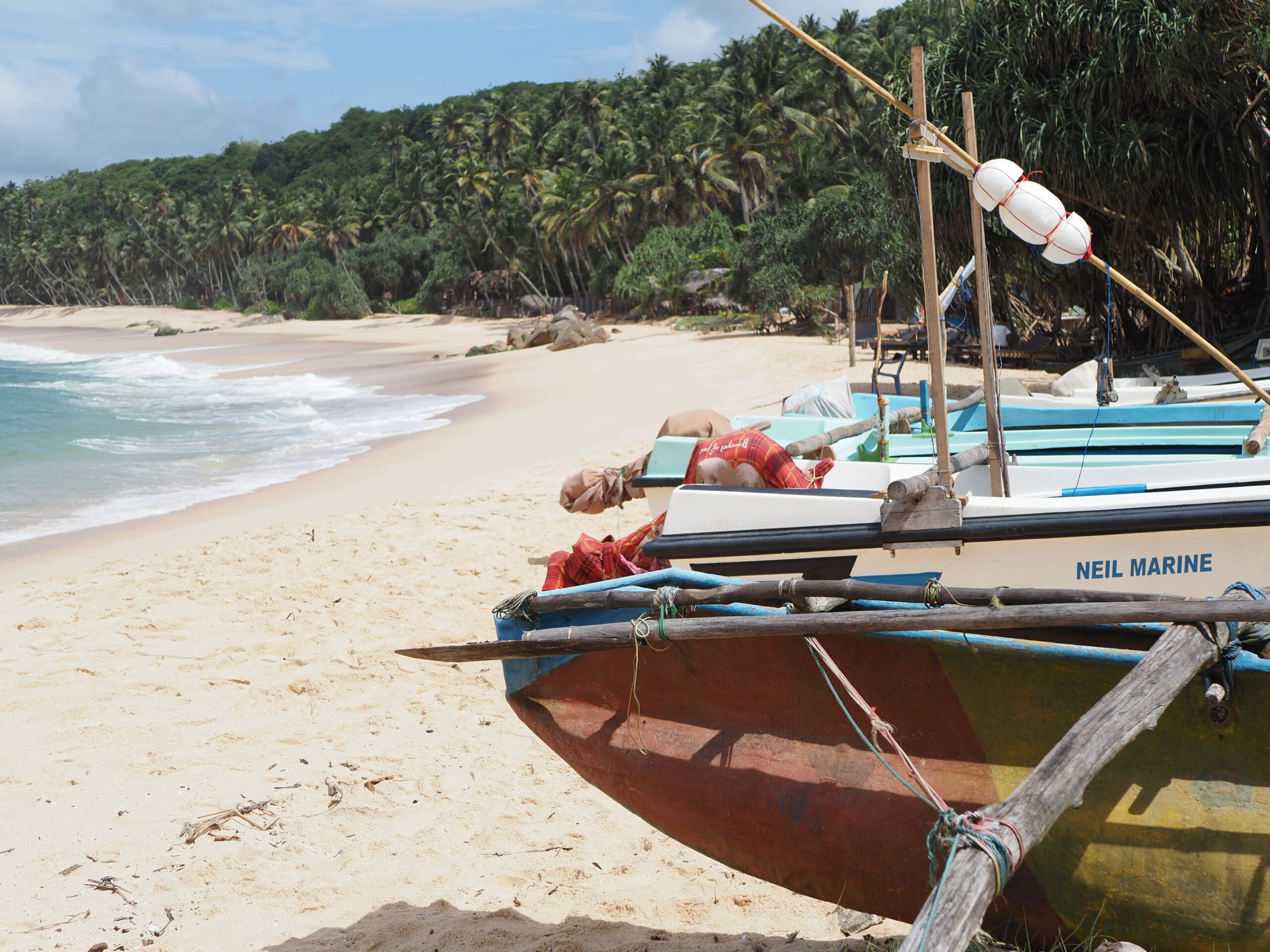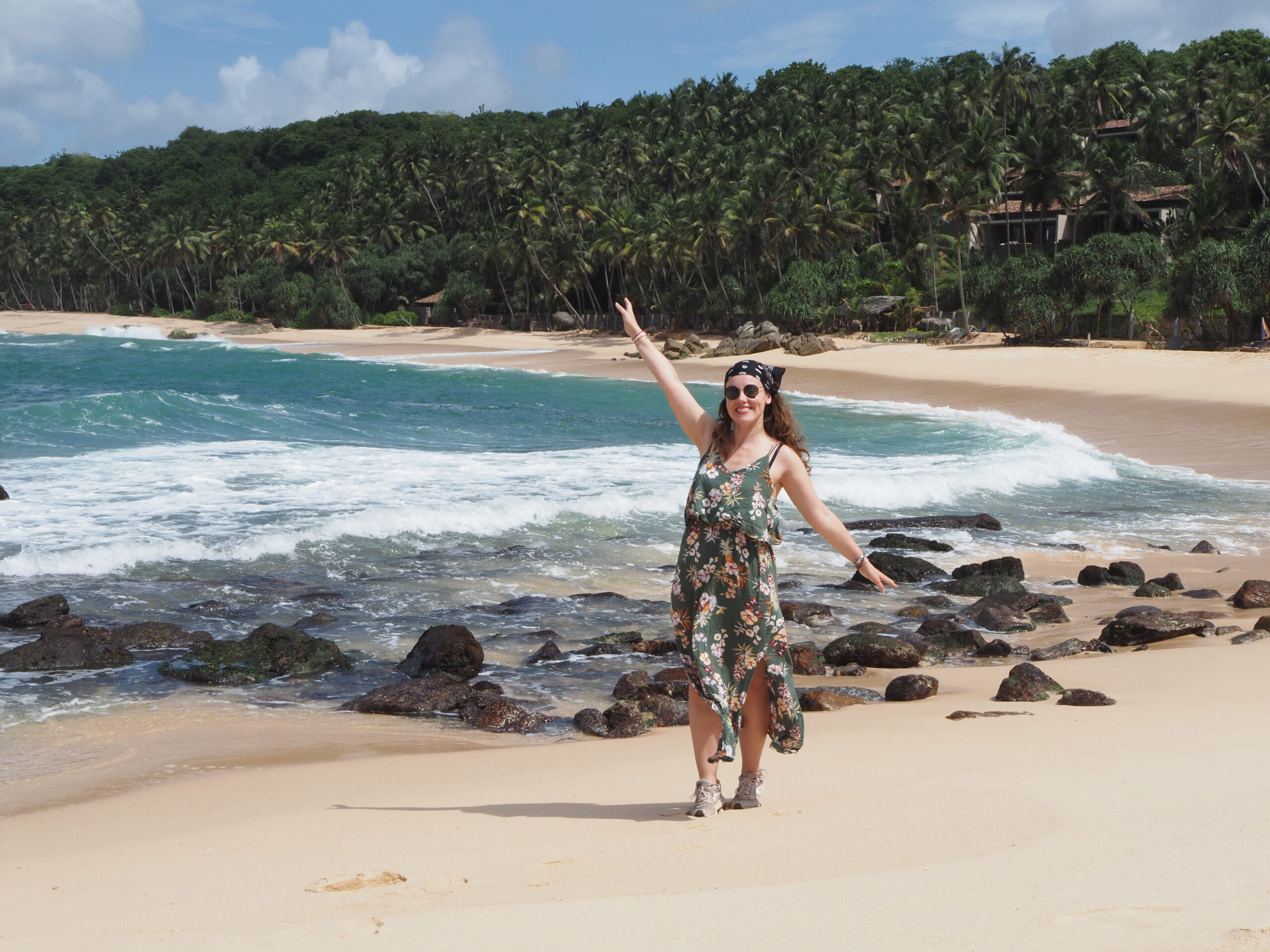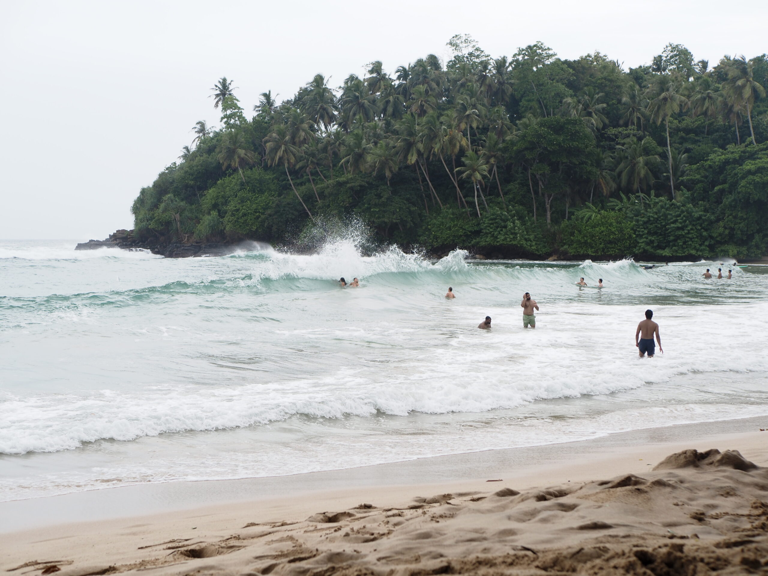 Lors de notre voyage au Sri Lanka, en pleine saison des pluies, l’océan était beaucoup trop agité pour se baigner. Mais même sans baignade, le cadre suffit à rendre l’endroit et le moment magique.